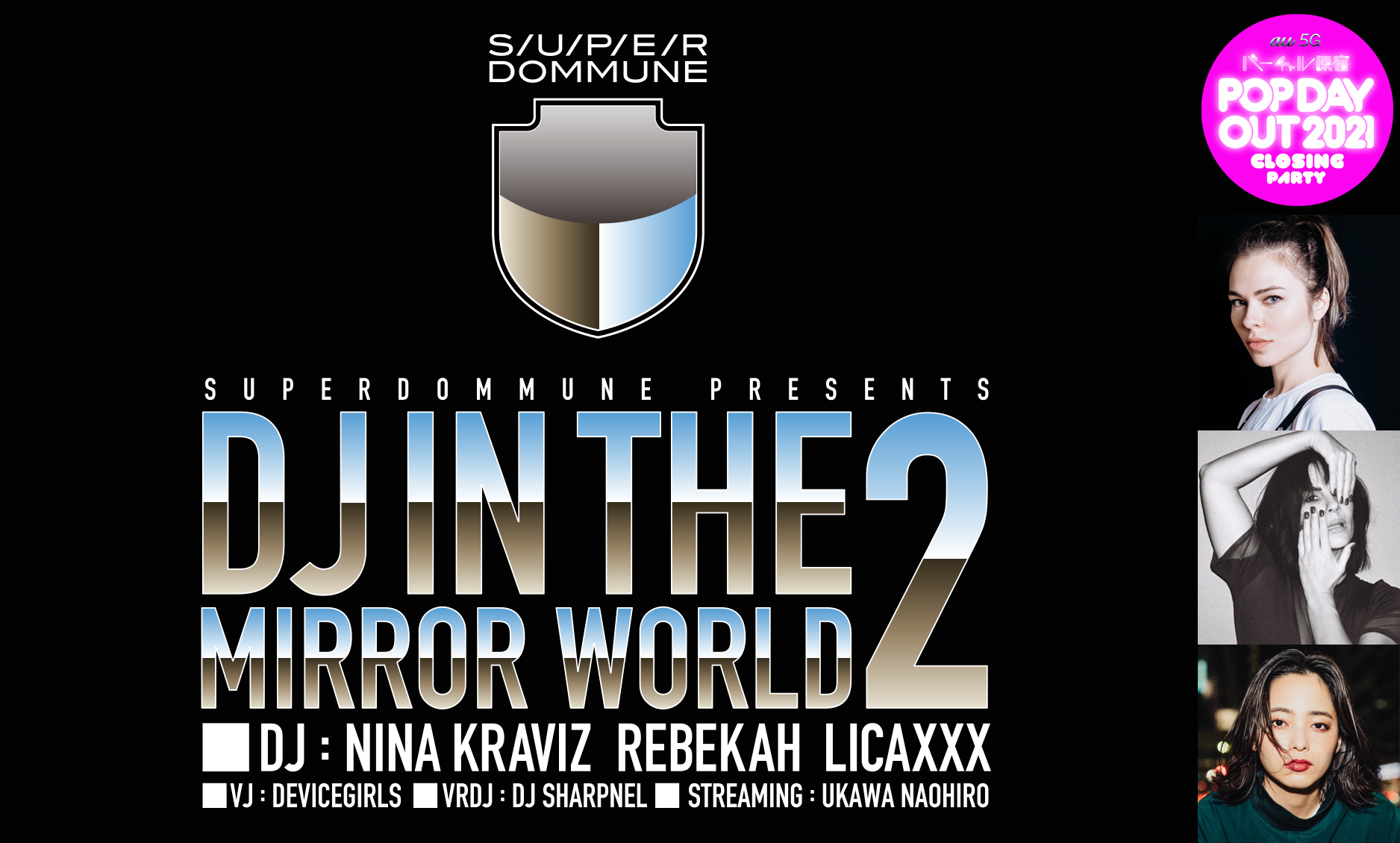 ■昨年バーチャル渋谷のハロウィーンフェスのクロージングを彩ったDOMMUNE「DJ IN THE MIRROR WORLD」が、バーチャル原宿 au 5G POP DAY OUT 2021 クロージングパーティーに再コネクト!今回はロシアが誇るスーパースターDJ=ニーナ・クラヴィッツと、バーミンガムのインダストリアル・テクノの女王=レベッカ、そして日本代表=Licaxxxの3人がアバターと化し、世界3ケ国から国境を超えて、ラフォーレ原宿と東急プラザ表参道原宿が向かい合う神宮前交差点デジタルツインに集結!
