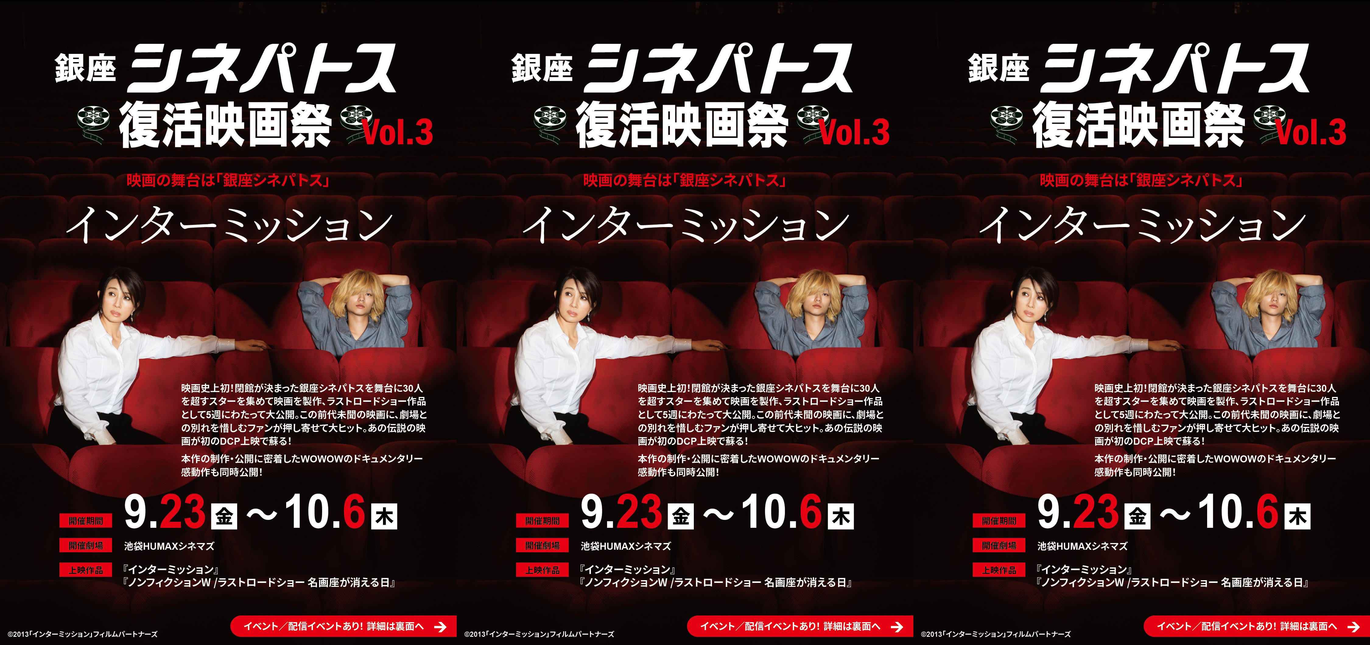 銀座シネパトスの名物支配人・鈴木伸英と意気投合して銀座シネパトスで「秋吉久美子映画祭」「原田芳雄映画祭」など数々の特集上映や贅沢なゲストのトークイベントを企画してきた映画評論家・樋口尚文は、2012年の春、鈴木から老朽化した劇場が耐震性の問題で一年後に閉館することを知らされる。多くの映画ファンの偏愛を集めた銀座シネパトスをたださめざめと見送ることに抵抗を感じた樋口は、全くの思いつきでシネパトスを舞台にした映画を作ってラストロードショー作品にすることを鈴木に提案。さっそくシナリオを仕上げながら賛同してくれるスタッフ、キャストを口説いてまわった。結果、一流のスタッフとそうそうたるスター33人が結集、2012年9月23日にまさかのクランクインを果たした。シネパトス閉館のニュースとともに『インターミッション』製作・公開を発表したインパクトは大きく、撮影中からNHKはじめ多くのメディアが取材に訪れ、2013年2月23日の公開日には多くの観客が並び、満員札止めに。脚本の名匠・山田太一氏は「とてもいいものを見た」と絶賛の評を寄せた。閉館日には熱狂的な盛り上がりとなった。今回はそのクランクイン10周年の日を記念して、9月23日から初のDCP上映での再公開となる。