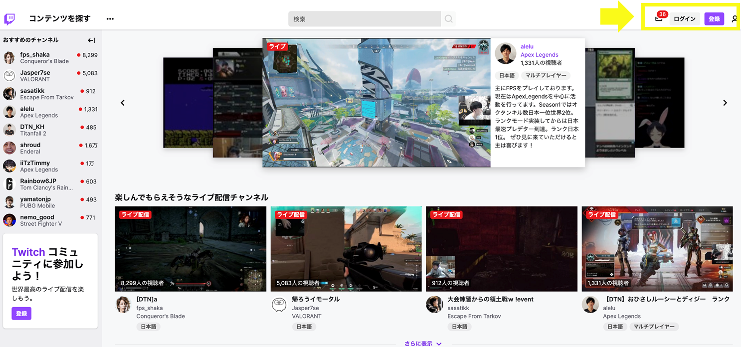 ■Step 1. Twitchにログインをします。登録をしていない方は登録をします。