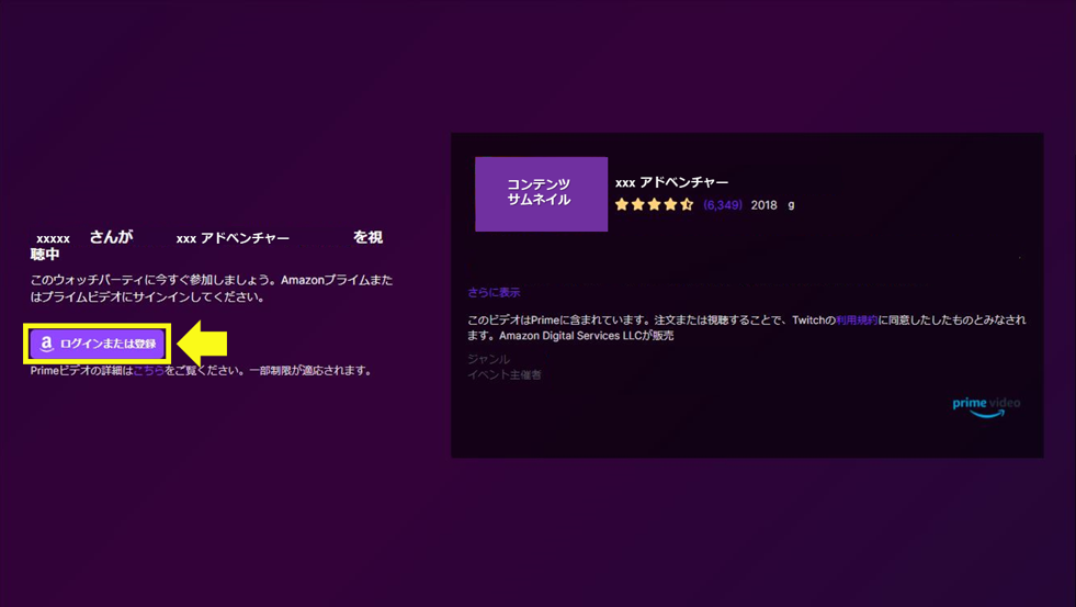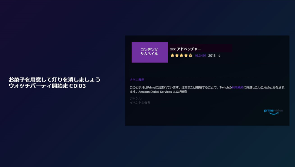 ウォッチパーティは、Twitch(ツイッチ)のストリーマー(配信者)がAmazonプライムやプライムビデオのサブスクリプションで見れる映画やテレビ番組を、Twitch上で視聴者と一緒にライブで見ながら、楽しめる機能です。ご利用の際は次の2つのアカウント(メンバー)登録が両方必要となります。登録がお済ではない方はご登録をお願いします。