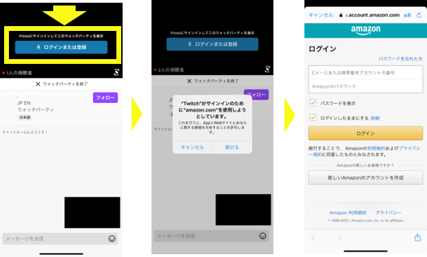 ■Step 2. 視聴したいチャンネルを選び、次はAmazon プライムへのログインをします。下の画面の遷移に沿って、ログインを行います。