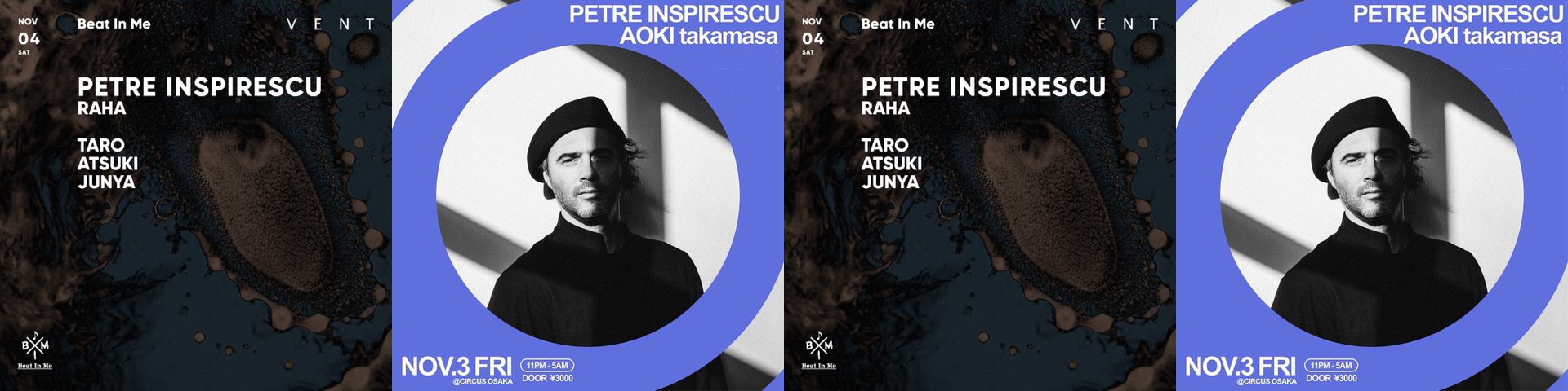 Rhadoo, Rareshと共に主宰する世界屈指のレーベル[a:rpia:r]、そしてその3人でのユニットRPR SOUNDSYSTEMで世界を席巻する孤高の芸術家が、2020年以来の復活開催となるBeat In Meに登場する。ルーマニアの最重要人物の一人Petre Inspirescu。その高いスキルと類い希な音楽センスによって生み出される常に安定した極上のグルーブは、世界中の耳の肥えたクラバー達を虜にし続けている。また一方で、彼から生み出される楽曲群はまさに世界最高水準と言うべきクオリティーを誇る、まさに唯一無二のアーティストである。コロナ禍でRareshとのパーティーを最後に長期中断していたBeat In Meにとっても、今回3年9ヶ月振りの復活を遂げるメモリアルな開催となる。国内のルーマニアン・ミニマル・シーンにとって、Rhadooと並び最も親和性の高いPetreを招いてのこの日の再スタートは、シーンにとっても大きな意味を持つであろう。11/3 CIRCUS 大阪、11/4、VENT 東京に先がけ、DOMMUNE では恒例となったPRE-PROGRAMをライヴストリーミング!!!!!!!