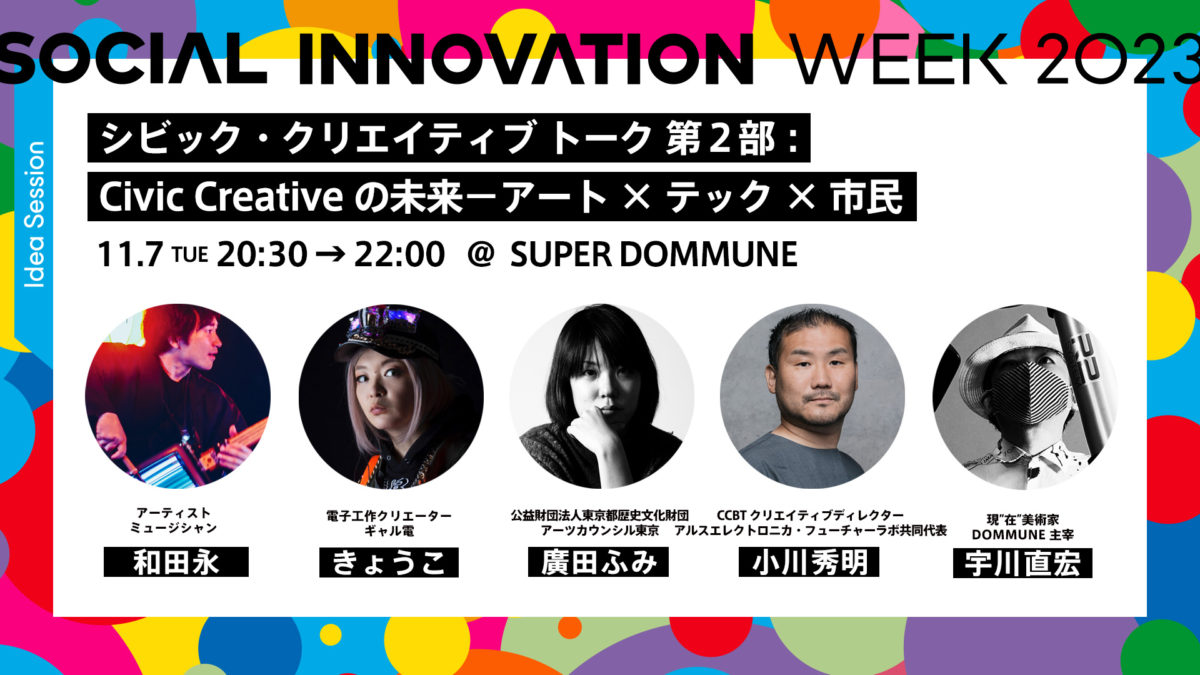 シビック・クリエイティブ・ベース東京[CCBT]と、ソーシャルデザインをテーマにした国内最大級の東京・渋谷の都市フェス「SOCIAL INNOVATION WEEK 2023」との共同企画でトークプログラムが開催![CCBT]は、アートとデジタルテクノロジーを通じて、人々の創造性を社会に発揮する(シビック・クリエイティブ)ための活動拠点です。ラボ、スタジオ等のスペースを備え、ワークショップなどのさまざまなプログラムを通じて、東京からイノベーションを生み出す原動力となっていきます。