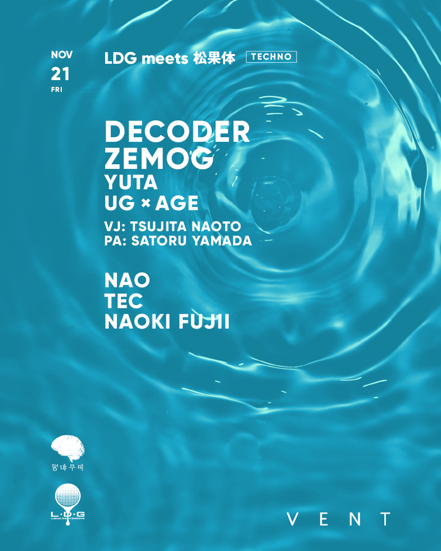 11/21金曜VENTで開催される “LDG meets 松果体”。ヒプノティックテクノのオリジネーターとしてアンダーグラウンドシーンの一角を担うレーベル〈Liquid Drop Groove〉と、東京を勃発点に胎動を続けディープテクノシーンの一端を担うパーティ松果体の5周年が邂逅する。本祭に先駆け、Jeff Millsもプッシュする奇才Decoder、〈LDG〉主宰のYUTA、松果体のageによるスペシャルプログラムをDOMMUNEにて開催。