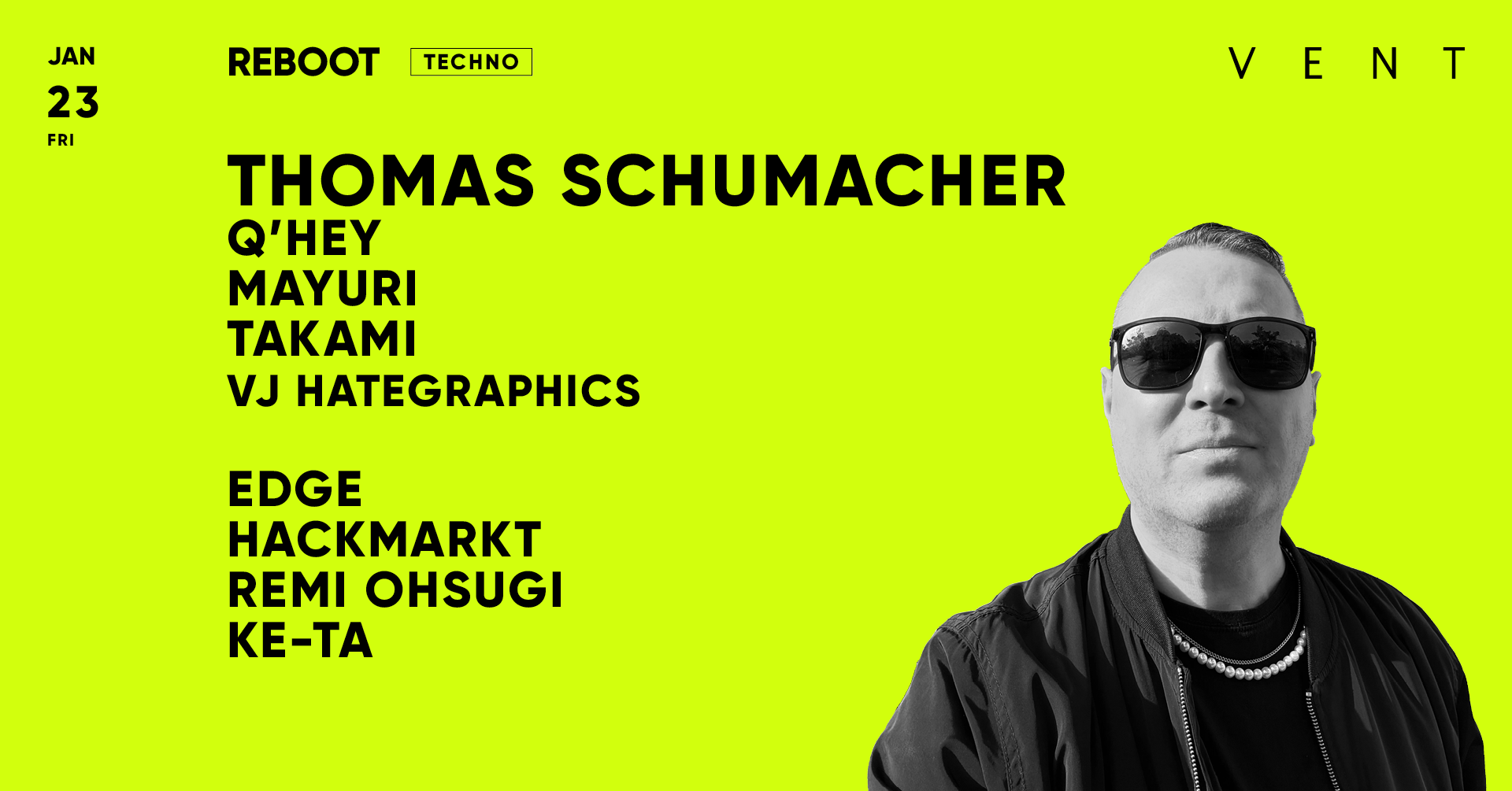 当日のROOM1には、THOMAS SCHUMACHERを筆頭に、Q'HEY、MAYURI、TAKAMIといったREBOOTレジデントDJ陣が集結し、2026年の幕開けを飾る。