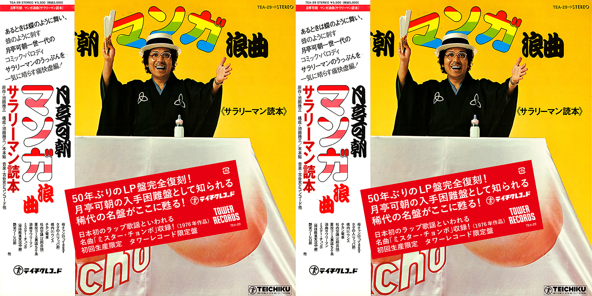 1976年10月にリリースされ、中古市場でも滅多に見られない高額取引で知られるレア盤、月亭可朝「マンガ浪曲 《サラリーマン読本》」の初となるアナログLPの完全復刻盤と、初CD化の2タイトルが発売されることが決定した。「嘆きのボイン」で80万枚以上のセールスを記録したほどの大ヒットとなり、落語家でありながら歌手としてもブレイクを果たした月亭可朝。本作では浪曲師になりきった可朝の話芸と歌が楽しめる抱腹絶倒の名盤。収録曲のなかでも、日本初のラップ歌謡といわれる「ミスター・チョンボ」の収録が目玉! そのほかシャンソン風の「あゝ懐しの青春時代」、「ひとり酒(歌謡曲)」も月亭可朝の美声が楽しめる名曲。LP、CDともに初回生産限定盤。現代の社会通念上、コンプライアンス的に問題があると思われる表現が入っておりますが、50年前の作品に敬意を表し、改変を行わず完全復刻盤としてのリリースとなります(どうぞご理解ください)。この奇跡のリイシューを記念して、DOMMUNEでスペシャルプログラムが配信される!題して、月亭可朝『マンガ浪曲《サラリーマン読本》』Release Special 「月亭可朝の不適切浄土」!!! 1976年、この不適切でグルーヴィーな「浪曲オペラ」は如何にして産み落とされたのか?生前2度のインタビューを実現させているプロ書評家の吉田豪を筆頭に、2018の80歳記念、落語家生活60周年の際の月亭可朝リバイバルの立役者である豊田道倫のZOOM出演、そして今回のリイシューのプロデュースを務めたTOWER RECORDの今村方哉、DJで和物ディガーでもあるコスプレ声ちゃん、2018年の生可朝師匠出演は未遂に終わったDOMMUNE総裁の宇川直宏の濃厚面子で送る月亭可朝SP!!!!!! 赤ちゃんもお父ちゃんもお母ちゃんも是非、お吸いください!!!!!!!!